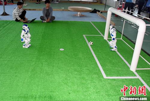 資料圖:2018年3月29日,廈門大學(xué)大學(xué)生創(chuàng)新創(chuàng)業(yè)實踐基地,大學(xué)生團(tuán)隊演示他們研發(fā)出的機器人足球。 中新社記者 孫自法 攝