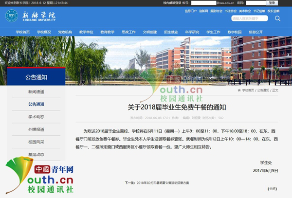 記者在該校官方網(wǎng)站看到,在公告通知一欄,該校學(xué)生處于6月9日發(fā)布了《關(guān)于2018屆畢業(yè)生免費(fèi)午餐的通知》,通知內(nèi)容為:為歡送2018屆畢業(yè)生離校,學(xué)校將在6月11日(星期一)上午9:00至11:00,下午16:00至18:00,在東、西餐廳門前發(fā)放免費(fèi)午餐券。畢業(yè)生憑本人學(xué)生證領(lǐng)取餐券壹張。就餐時(shí)間為6月12日上午10:00—14:00,在東、西餐廳一、二樓指定窗口或西服務(wù)區(qū)小餐廳領(lǐng)取套餐一份。望廣大師生相互轉(zhuǎn)告。