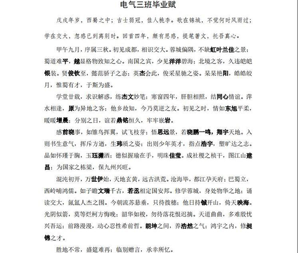 說寫就寫的王一鳴,僅用了一個下午就完成了這篇作品,發(fā)在班級群里,讓大家提提建議,同學們紛紛夸贊王一鳴有心、有文采,都說這是收到的最棒的畢業(yè)禮物,并且要把這篇《電氣三班畢業(yè)賦》印在畢業(yè)冊上。