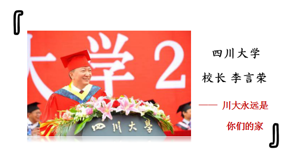 同學(xué)們,川大就是你身后的遠(yuǎn)景,順境時(shí)為你們祝福、為你們高興,逆境時(shí)就是你背后的靠椅,給你以支撐。同學(xué)們,昨天晚上我在學(xué)校BBS上看到一位小哥的留言:藍(lán)天在上,黃土在下,若干年后,再約川大!待到那時(shí),都成爹媽,勵(lì)志兒女,還考川大!同學(xué)們,不管大家今后身在何地、身處何境、身遇何事,川大永遠(yuǎn)是你們的家。