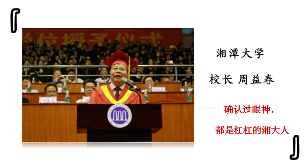 今天在座的你們,陌生又熟悉。陌生的是,我叫不出每個(gè)人的名字,說(shuō)不出每個(gè)人的專業(yè);熟悉的是,我們或者在教室聽過(guò)課,或者在食堂拼過(guò)桌,或者在校園擦肩而過(guò)。我想,假如顏值可以當(dāng)飯吃,你們一定可以養(yǎng)活整個(gè)世界!今天,我站在這里,又一次跟大家確認(rèn)了眼神,你們都是杠杠的湘大人!都是永遠(yuǎn)的湘大姑娘、永遠(yuǎn)的湘大小伙!