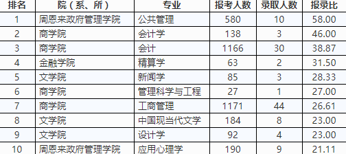 下面,我們就通過4所熱門高校報錄比排名前10的專業(yè)來看一下那些相對難考的專業(yè)有哪些: