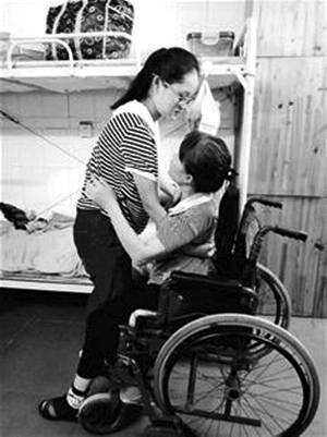 5日上午11時(shí)許,送郭紅雁和媽媽張顯翠的車駛?cè)腴L(zhǎng)江大學(xué)東校區(qū)。車窗外是怡人的校園風(fēng)光,郭紅雁跟媽媽一邊看一邊說,十分高興。到了漢科學(xué)院公寓,在校方負(fù)責(zé)人及學(xué)生志愿者幫助下,張顯翠被抱上輪椅。一進(jìn)入宿舍,母女倆都睜大了眼睛。