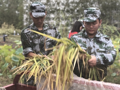據(jù)介紹,川大錦城這一片金燦燦的稻谷于今年4月栽種,經(jīng)過(guò)了幾個(gè)月生長(zhǎng),迎來(lái)了大豐收,“這是我們自己種的,現(xiàn)在自己來(lái)收割,感覺特別有意義!苯Y(jié)束了上午軍訓(xùn)的大一學(xué)生也來(lái)到了現(xiàn)場(chǎng),幫忙打谷子。