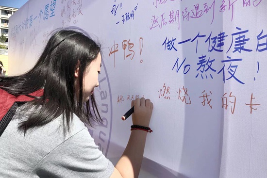 大連外國語大學(xué)新生在簽名墻上簽字。大連外國語大學(xué)融媒體中心 羅斕/攝