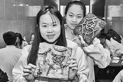 山東煙臺王懿榮紀念館,菲律賓華裔青少年在展示制作的甲骨文“!弊。新華社發(fā)