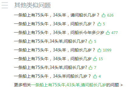 而從小學(xué)生的思維出發(fā),則是將題干中的75與34這兩個數(shù)字進行加減乘除運算,75減去34等于41,是在1到100之間,所以,多數(shù)人會覺得船長的年齡可能是41歲。