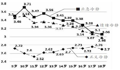 調(diào)查側重考察了兒童在應急情境、情緒激動和正義需要援手情境中的冷靜品質,發(fā)現(xiàn)兒童冷靜品質在遭遇不同情境中情緒調(diào)控性表現(xiàn)出不同的發(fā)展趨勢。在一般應急情境和情緒激動中的兒童冷靜品質分值有隨年齡增長而下降的趨勢,意味著兒童在應急與情緒激動情境下隨著年齡增長而更容易沖動,不能控制自己;而在遇到有需要援手等正義需求情境時,兒童冷靜品質的得分有隨年齡增長而升高的趨勢,意味著這種情況下,年齡越大的兒童越能控制自己的行為。