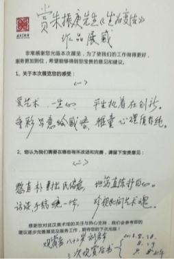 十年間,劉務(wù)本給武漢美術(shù)館大大小小的畫展寫了近百條留言,其原則是“取共性,存異性,尊重藝術(shù)家的人格和風(fēng)格!币驗檎嬲\獨到的點評,她在武漢藝術(shù)圈也小有名氣,藝術(shù)家陳立言、謝申等曾親自到她家中拜訪交流。