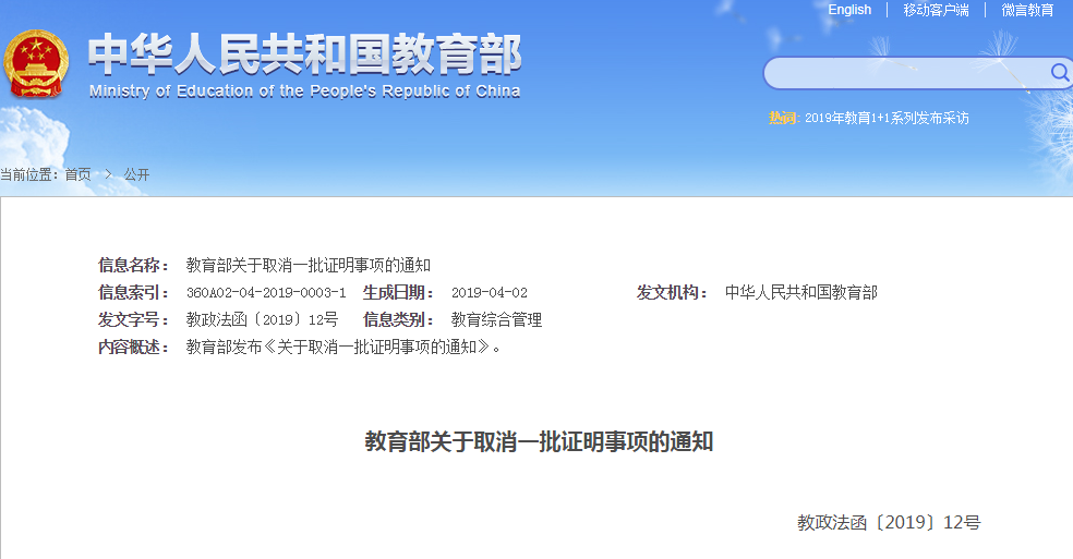 據(jù)教育部網(wǎng)站獲悉,為減證便民,辦好人民滿意的教育,教育部公布取消一批證明事項(xiàng),即部門(mén)規(guī)章設(shè)定的10項(xiàng)證明事項(xiàng)、部門(mén)規(guī)范性文件設(shè)定的12項(xiàng)證明事項(xiàng),以及無(wú)明文規(guī)定但在部分地區(qū)或?qū)W校實(shí)施的7項(xiàng)證明事項(xiàng)。