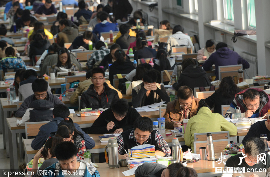 2013年10月29日,山西太原,目前2014年考研報名即將收官,備戰(zhàn)考研的大學(xué)生們進(jìn)入了最后的沖刺階段。記者利用近一周的時間,進(jìn)入山西大學(xué)、太原理工大學(xué)、山西醫(yī)科大學(xué)等高校,晝夜跟拍備戰(zhàn)考研的“學(xué)霸”們,用鏡頭記錄下他們考研路上的苦樂日子。自習(xí)室、圖書館、走廊、宿舍……在大學(xué)校園里,隨處都能看到考研的學(xué)生在埋頭苦讀的身影,他們懷揣著研究生夢想,準(zhǔn)備抓住考前兩個月的時間“血拼”一把。