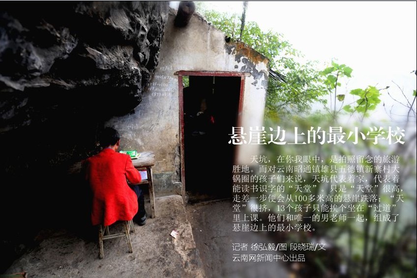 大鍋圈位于云南昭通鎮(zhèn)雄縣五德鎮(zhèn)新寨村,屬天然“天坑”,平均深度120米,最深處達(dá)150米,絕壁陡峭險(xiǎn)峻。教室不遠(yuǎn)處僅有的空地便是孩子們課間玩樂(lè)的場(chǎng)所,與記者的小心翼翼相比,孩子們面對(duì)懸崖早已習(xí)以為常。