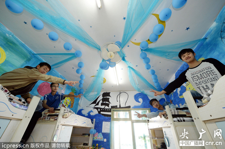 2013年10月26日,重慶西南大學學生會舉辦了一場新生宿舍美化大賽,數以千計的新生參與。許多創(chuàng)意獨特的95后,花了不到200元,就把寢室裝出了高端洋氣上檔次的格調。卡通賣萌、奇幻漂流、文藝范兒……來看看他們的宿舍風格與背后的故事吧。可愛卡通墻每人有萌名宿舍:經濟管理學院工商管理專業(yè)大一男生宿舍竹園C棟316室花費:不超過100元,主要花費在顏料紙張上畫著卡通小黃人的墻、維尼熊馬克杯、小螞蟻粉T恤……若不是墻角散落著的幾只略有味道的球鞋,你很難將眼前這間宿舍與男生聯(lián)系在一起。這間宿舍萌至如此,必須歸功一個人:宿舍的賣萌小王子詹鑫豪。自打入校的第一天起,發(fā)嗲、買各類賣萌產品……詹同學盡顯賣萌本色。在他的影響下,宿舍其他5個哥們也發(fā)現了自己的賣萌天分,集體賣萌成了宿舍的風氣。比如:大家集體購買了一系列風格迥異的卡通睡衣,包括奶牛版、熊貓版等;再比如,大家有了一個個超萌的外號:大狼、肥羊、猴子、毛毛、嚶。在寢室美化設計時,詹鑫豪出力不少!拔覀冇媱澰趬ι袭孅c東西,但別的東西都好難畫,我突然想到近期看的動畫片《卑鄙的我》里的小黃人,不是正好又萌又簡單嗎?”全宿舍一致認可這個提案,詹鑫豪更主動承擔起為小黃人上色的任務。自稱“不擅賣萌”的周密同學表示,“相比很多同齡人,我們宿舍顯得比較幼稚。但用萌這種方式記錄生活,算是青春記憶吧!弊霞喪酵挷璧纴硐喟樗奚幔和鈬Z學院免師英語專業(yè)大一7班女生宿舍桃園1棟201室花費:不超過200元,主要用于買卡通畫和紫紗擁有一個童話古堡,是萬千少女的夢想,英語班的幾位同學把它變成了現實。最初,室長吳倩一提議走公主風,立馬獲得壓倒性的支持。此后給宿舍起名字、設計細節(jié)等,遇到意見不一致時,都是以少數服從多數為原則,“但有一點:不能放馬后炮。”各自衣柜上的維尼熊、米老鼠,搭在蚊帳上的層層紫色紗布,甚至在廁所門前專門貼了一張公主畫……公主風鋪天蓋地而來。這間宿舍在全院打響名號,除了夢幻的布置,還離不開室友袁凡的宣傳。宿舍里兩套精致的茶幾頗引人注目,它們的主人、被同學們盛贊為“茶神”的妹子來自云南,家鄉(xiāng)盛產普洱茶,“我們家很多人是茶文化愛好者。我平時泡了茶,就會喊大家來喝,享受泡茶、品茶的過程!睍r光軸愛上照片墻宿舍:經濟管理學院農業(yè)經濟管理大一1班女生宿舍南苑9舍525室花費:不超過200元,錢主要用在購買顏料、卡紙等上愛拍照、愛旅游、愛泡咖啡館……在王麗君看來,宿舍姐妹們雖然性格有靜有動,但或多或少都有顆文藝的心。這也很好地解釋了為什么舍長宋錦雯一提議宿舍美化走文藝范,大家都舉雙手贊成!安蝗绾腿巳司W一樣,我們也建一個實體版的時光軸”、“不如我們貼上黃色的墻紙,讓宿舍看起來像個咖啡館”……確立主題后,舍友們你一言我一語開始構思細節(jié)。很快,時光軸火速出爐,事后它確實成為了宿舍的一大標志。時光軸的主材料是涼席和各張打印出來的照片以及文字解說。時光軸上,記錄了大家相處的兩個多月美好時光。王麗君向記者介紹,“第一張是軍訓開始前在宿舍的第一張合影,第二張是軍訓拉練時我們疲憊狀態(tài)下的自拍,第三張是班級第一次聚餐,我們宿舍的坐在一起……”談起“時光軸”的未來,王麗君表示,“我們都是自拍狂,也特別喜歡記錄生活的點點滴滴,所以未來肯定會有更多精彩照片,我們還會分享出來,當然那時我們可以選擺更美的照片!