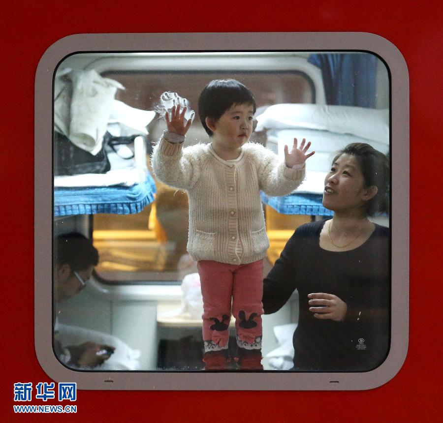 在上;疖囌荆X女士扶著自己的孩子在車窗邊玩耍,他們乘坐1228次列車返回老家唐山,將在火車上度過20個小時(2月4日攝)。列車車窗,在鏡頭中猶如用畫框裝裱的圖案,定格了分別的不舍、回家的不易和對團圓的憧憬。2月4日春運首日,鐵路總公司發(fā)布的數(shù)據(jù)顯示,全國鐵路發(fā)送旅客577.3萬人次。交通運輸部預計,2015年春運全國旅客發(fā)送量將達到28.07億人次,比2014年增長3.4%。新華社記者 裴鑫 攝