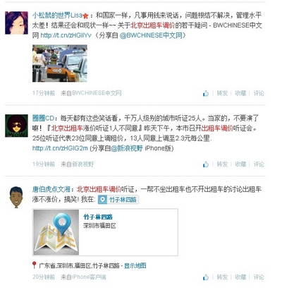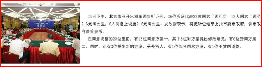 對于北京出租車調價一事,市發(fā)改委副主任劉印春表示,下一步,將把聽證會上的意見建議向市委市政府匯報,作為價格調整工作決策重要的參考,最終由市政府決策。不過北京北京出租車的調價幾乎已成定局。 25位代表,明確表示反對意見的僅有1人。是漲價切實應該?微博上對于出租車漲價持反對意見的聲音卻明顯與聽證結果不同。多位網(wǎng)友與評論員均認為,出租車司機收入低,根源并不在低價上,漲價也不能理想化的解決所有問題。這幾乎成了微博上的主流聲音。那么,為何聽證會的結果會同這些聲音出現(xiàn)“岔路”? |