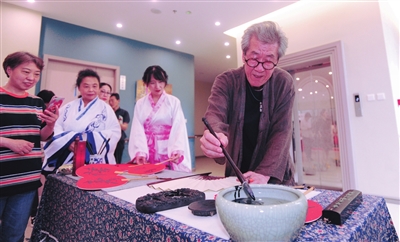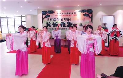 “粽香四溢飄蕩,扇面書法有長(zhǎng);姐妹演繹漢禮,描紅寫就詩(shī)章;答題接龍獲獎(jiǎng),節(jié)日歡聚一堂;企業(yè)搭臺(tái)唱戲,居家養(yǎng)老歡唱!”活動(dòng)現(xiàn)場(chǎng),一位阿姨自告奮勇地要向大家分享她即興創(chuàng)作的小詩(shī),“今天能夠與大家歡聚一堂,一起過(guò)節(jié),一起體味傳統(tǒng)文化,是一種難得的體驗(yàn)和經(jīng)歷。我們?cè)敢馀c年輕人一起,為振興傳統(tǒng)文化、發(fā)揚(yáng)優(yōu)秀民俗貢獻(xiàn)一份自己的力量。”
