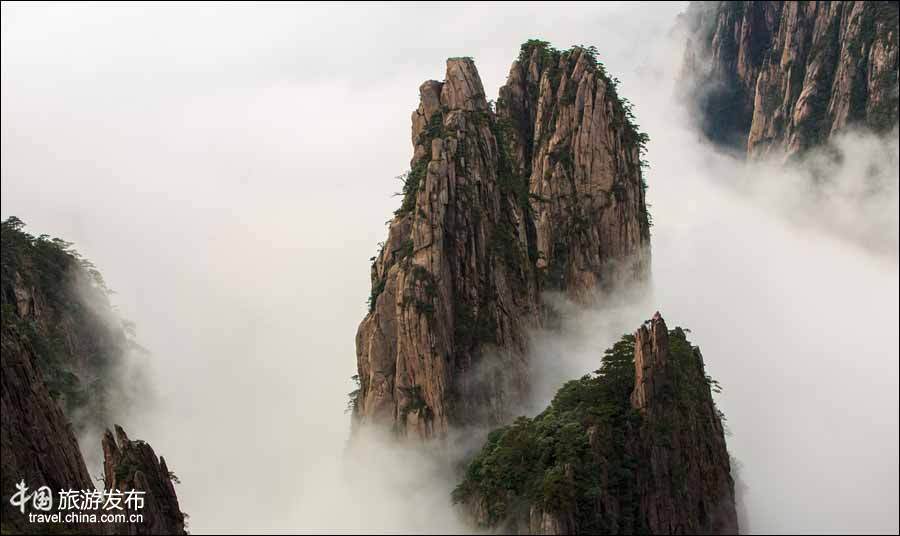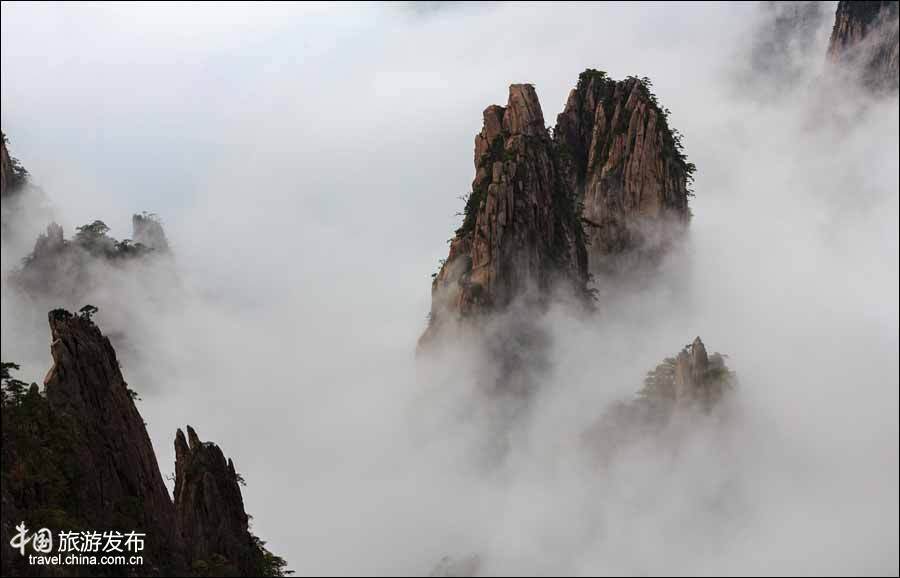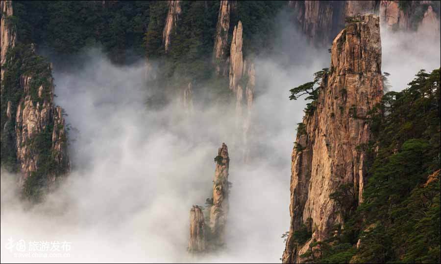 【點(diǎn)睛】“雨后黃山更奇絕”,這是清初詩壇盟主錢謙益在游覽黃山后興之所至。10月30日,綿綿的秋雨過后,黃山西海景區(qū)云霧彌漫,樹林中騰起的層層云霧,環(huán)繞著青山黛色,飄渺在山峰間,時而云遮霧罩,時而青煙縹緲,時而四方慢云,時而暗流涌動,峰在云中、石在樹中、人在畫中的畫卷緩緩鋪展。