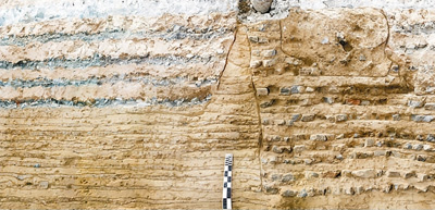 仔細觀察可以看到,夯土堆積層為一層夯土層一層鋪磚層,層層疊壓。夯土為深褐色黏土,大致平面分布,較致密,每層厚度不等。而素土夯土層,開口距地表1米,最深處距地表3米,為黃色綿沙土、褐色黏土和黃色細沙土,層層夯筑,大體呈平面或波狀分布,有的夯層包含少量堅硬的料礓石塊?脊殴さ貓(zhí)行領(lǐng)隊徐華鋒介紹:“從層位關(guān)系判斷,夯土鋪磚層建筑基槽、素土夯筑層為該遺址最早的一組堆積。夯土鋪磚層堆積的土質(zhì)土色、包含物、建筑工藝等與慈寧宮花園東院遺址的夯土夯磚層明顯一致,可早到明代早期;而素土夯筑層出土的布紋瓦、琉璃瓦、黑釉、白釉瓷片等遺物具有明顯的金元時代風(fēng)格。按照考古發(fā)掘‘就晚不就早’的原則,根據(jù)地層關(guān)系和包含物可以初步推斷夯土鋪磚層建筑基槽和素土夯筑層的年代為元代!