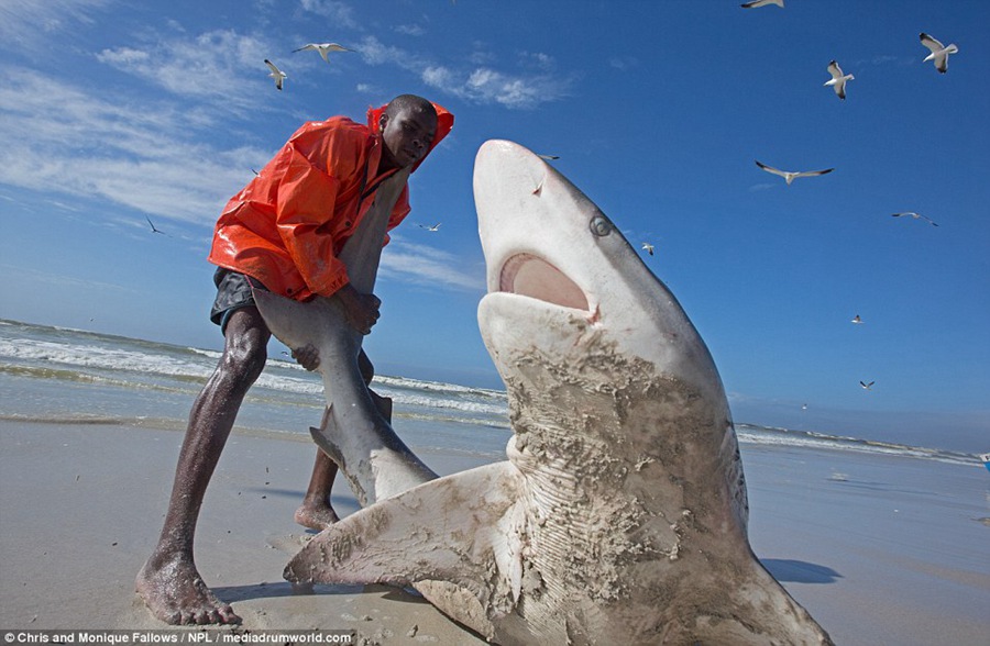 南非漁人勇救落網(wǎng)鯊魚 拽尾巴拖回大海