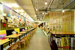 言幾又,看名字就知道,“言幾又”,合起來就是設(shè)計(jì)的“設(shè)”,這里玩兒的就是設(shè)計(jì)。不僅賣咖啡、簡餐,還賣書和創(chuàng)意商品。其實(shí)嚴(yán)格來說,這里并不是一家餐廳,而是一家創(chuàng)意書店。就餐區(qū)內(nèi)一個(gè)一條十多米長的“書墻”,也是這里的主要特色,讓文藝青年們在就餐的同時(shí)也能感受到富有鮮活生活方式的文學(xué)氣息。餐區(qū)內(nèi)通過使用簡單的材料組合,如木頭、磚頭以及混凝土地板平臺營造出令人放松的環(huán)境氛圍,傳遞出一種現(xiàn)代的簡潔新潮風(fēng)格。