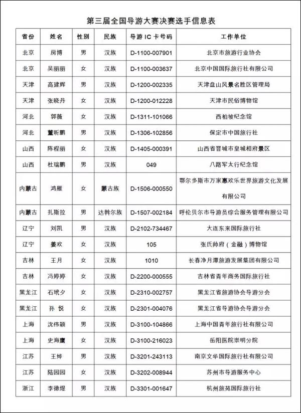 現(xiàn)將決賽選手名單進行公示,公示期為即日起至3月15日。如有異議,請于公示期內向國家旅游局反映。(伍策 一。