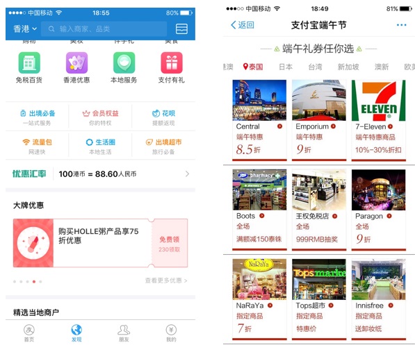 比如,在港澳臺,打開支付寶“發(fā)現(xiàn)”,你可以找到屈臣氏、豐澤電器、瑞士雷達(dá)表、長板壽司的5折優(yōu)惠券;在日本,可以找到唐吉坷德滿3萬日元立減2000的優(yōu)惠;新加坡可以找到4折的名勝世界演出票等等。使用時(shí)也很方便,領(lǐng)取后只要打開優(yōu)惠券,點(diǎn)擊付款就能安優(yōu)惠價(jià)掃碼付款。
