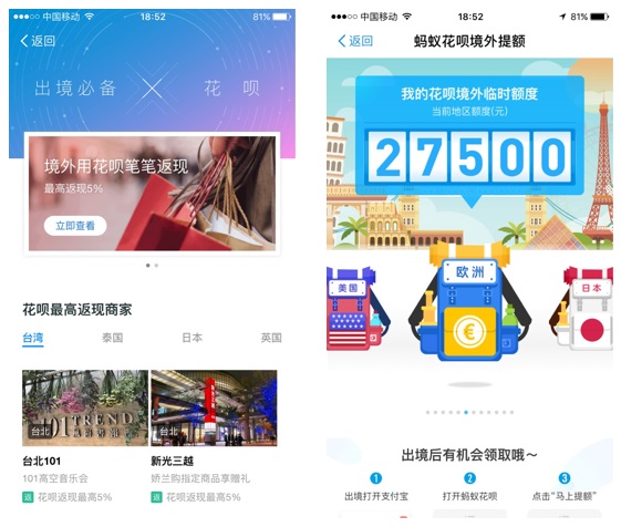 目前,支持支付寶的10多萬個(gè)商鋪都能用花唄付款,基本覆蓋了出境游客的日常消費(fèi)場所。如果覺得還不夠花,可以在支付寶里申請花唄臨時(shí)提額,最高3萬元額度,保證你既能花又能省。