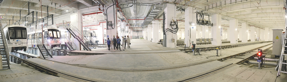 崔家店停車場負(fù)一層軌行區(qū)停放著一排地鐵7號線的列車。順著軌道往前、往后望,都沒有看到停車場的盡頭!拔覀儸F(xiàn)在看到的這部分只相當(dāng)于崔家店停車場面積的四分之一!背啥嫉罔F運營公司新線部副部長張自鵬介紹,崔家店停車場不僅是成都地鐵首個地下雙層停車場,也是國內(nèi)目前在建的最大規(guī)模全地下地鐵車輛綜合檢修基地!拔挥18米深的地下,分上下兩層。有聯(lián)絡(luò)線區(qū)、列檢庫及汽車庫區(qū)、運用庫區(qū)等,可同時停放76列地鐵列車。”停車場負(fù)一、負(fù)二層軌行區(qū)已正式移交并投入使用。