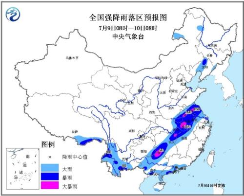 預(yù)計,7月9日08時至10日08時,江蘇、安徽、河南東南部、湖北東部、江西西北部、湖南西南部和東北部、貴州東南部、廣西北部和南部沿海、廣東南部沿海、云南中西部、遼寧西部等地的部分地區(qū)有大雨或暴雨,其中蘇皖北部、湖北東北部、廣西北部、湖南西南部等地局地有大暴雨(100~160毫米);上述部分地區(qū)有短時強(qiáng)降水,局地伴有雷暴大風(fēng)等強(qiáng)對流天氣,最大小時雨強(qiáng)可達(dá)20~40毫米,局地超過60毫米。