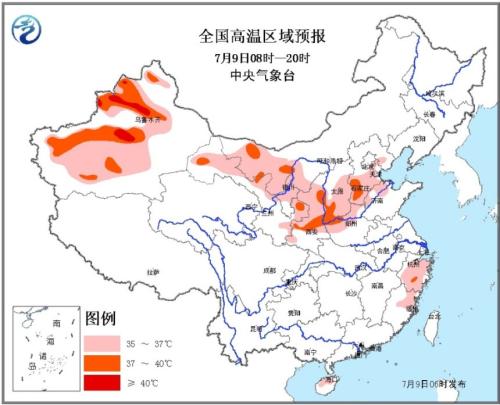 預(yù)計,7月9日白天,內(nèi)蒙古西部、甘肅北部、寧夏北部、陜西中部、山西中南部、河北中南部、山東西北部、河南西北部、新疆西北部和南疆盆地等地有35℃以上的高溫天氣,其中,河北南部、山西西南部、陜西關(guān)中地區(qū)、新疆西北部和南疆盆地等地的部分地區(qū)最高氣溫可達(dá)37~39℃,局地可超過40℃。