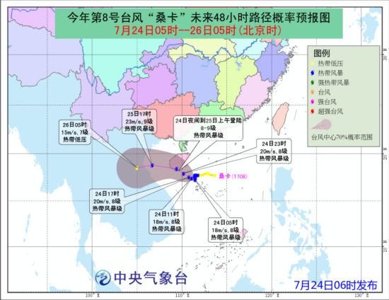 據(jù)中央氣象臺網(wǎng)站消息,7月24日06時繼續(xù)發(fā)布臺風藍色預警:今年第8號臺風“桑卡”(熱帶風暴級)的中心今天(24日)早晨5點鐘,仍位于海南三亞東偏南方約230公里的南海中西部海面上,中心附近最大風力有8級(18米/秒),中心最低氣壓為998百帕,七級風圈半徑80公里。