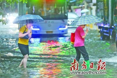 26日下午5時(shí)30分,廣州越秀區(qū)東湖西路永勝上沙,暴雨突襲,街坊們小心翼翼地蹚水而過(guò)。 南方日?qǐng)?bào)記者 李細(xì)華 攝影報(bào)道