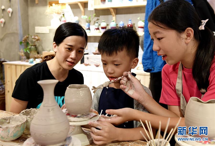 小游客在鼓浪嶼商鋪學(xué)習(xí)陶藝(8月29日攝)。被列入世界文化遺產(chǎn)名錄的廈門鼓浪嶼以其風(fēng)格迥異、中西合璧的建筑,富有特色的商鋪吸引了四面八方的游客。 新華社記者 張國俊 攝 -