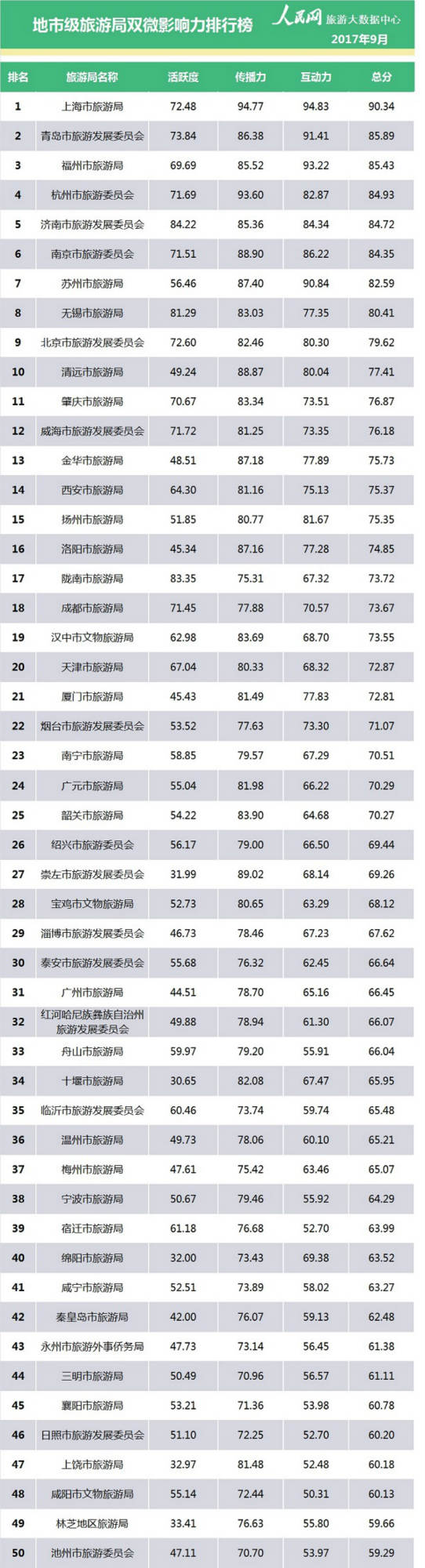人民網(wǎng)輿情監(jiān)測(cè)室發(fā)布2017年9月全國地市級(jí)旅游局雙微影響力排行榜,榜單以全國范圍內(nèi)的地市級(jí)旅游局官方認(rèn)證微博、微信為評(píng)價(jià)對(duì)象,綜合考察活躍度、傳播力和互動(dòng)力三個(gè)指標(biāo),通過海量數(shù)據(jù)分析和復(fù)雜的數(shù)理模型計(jì)算,全面、立體、準(zhǔn)確地反映旅游系統(tǒng)新媒體的發(fā)展?fàn)顩r。