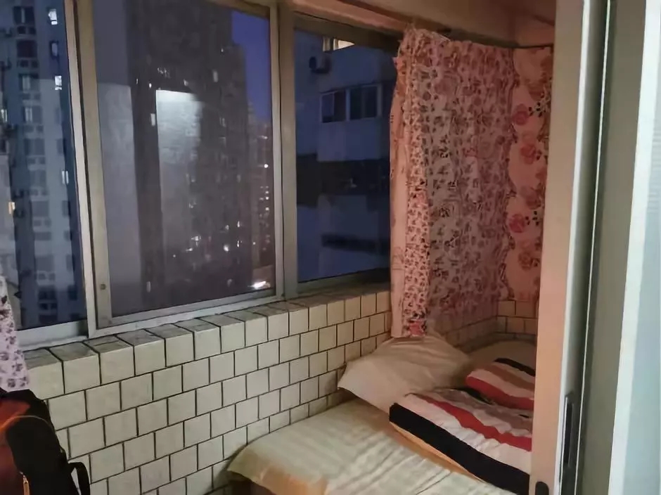 10月末的一晚,最低溫度5攝氏度。當(dāng)記者推開預(yù)訂好的“經(jīng)濟(jì)間”房門時(shí),發(fā)現(xiàn)居然是個(gè)陽(yáng)臺(tái)。房間內(nèi),床和小桌子緊貼兩側(cè)墻壁放置,中間僅有一人站立的空間,天花板上還掛著晾衣桿,陽(yáng)臺(tái)和客廳間的門無(wú)法上鎖。