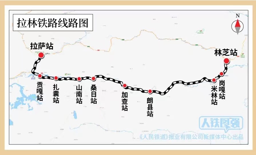 拉林鐵路起自西藏自治區(qū)拉薩市,經山南市貢嘎縣、扎囊縣、乃東區(qū)、桑日縣、加查縣和林芝市朗縣、米林縣,到達林芝市區(qū),全長435.48公里,設計時速160公里,為國家I級單線電氣化鐵路,初期開通運營辦理客貨運輸業(yè)務的有貢嘎、扎囊、山南、桑日、加查、朗縣、米林、崗嘎、林芝9個車站。