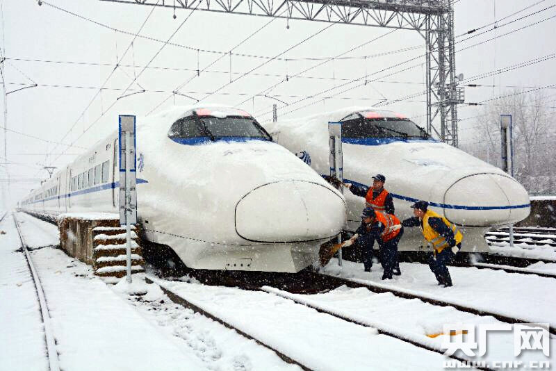 2018年1月4日,合肥南動(dòng)車運(yùn)用所內(nèi),職工正在為即將上線運(yùn)行的動(dòng)車組進(jìn)行掃雪除冰。(央廣網(wǎng)發(fā) 謝冰飛攝) 央廣網(wǎng)北京1月5日消息(記者何微)4日,由于大范圍、高強(qiáng)度的降雪,不少地區(qū)的鐵路運(yùn)輸受到不同程度影響。多地列車出現(xiàn)延誤和停運(yùn)情況,京廣、鄭徐、鄭西、西成等部分線路采取限速運(yùn)行措施。影響范圍覆蓋湖北、河南、安徽、江蘇、陜西、四川等地。有計(jì)劃乘火車去往或途經(jīng)上述地區(qū)的乘客請(qǐng)密切注意鐵路部門的信息公告。鐵路部門已經(jīng)啟動(dòng)應(yīng)急預(yù)案,組織數(shù)萬名鐵路干部職工掃冰除雪,努力確保旅客出行安全暢通。 -