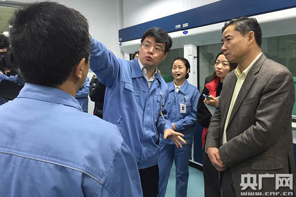 工業(yè)和信息化部副部長辛國斌(右一)在九江石化總經(jīng)理覃偉中(左二)的陪同下,參觀九江石化工廠。央廣網(wǎng)記者高藝寧_攝
