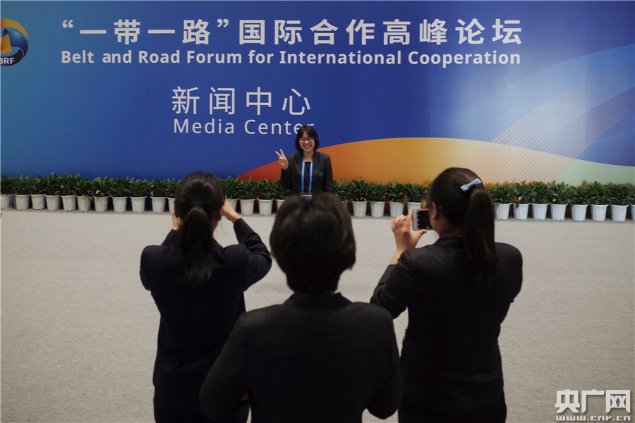 在“一帶一路”國際合作高峰論壇新聞中心內(nèi),工作人員們紛紛合影留念。(央廣網(wǎng)記者 王永康 攝) -
