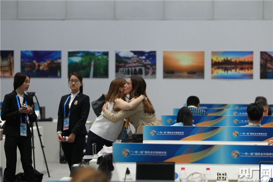 在“一帶一路”國際合作高峰論壇新聞中心內(nèi),兩名記者擁抱告別。(央廣網(wǎng)記者 韓靖 攝) -