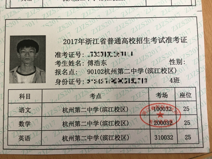 2017年6月5日,浙江省杭州二中高三學生傅浩東從老師手里接過了準考證。