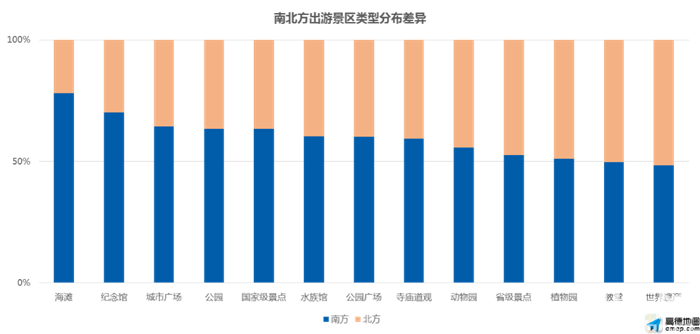 此外,從南北方景區(qū)出游類(lèi)型分布差異上看,十一黃金周期間預(yù)計(jì)南方的出游用戶(hù)比例將高于北方,其中受溫度影響,海灘游南方將明顯高于北方,而在世界遺產(chǎn)、教堂類(lèi)景區(qū)的出游占比上,北方則偏高于南方。