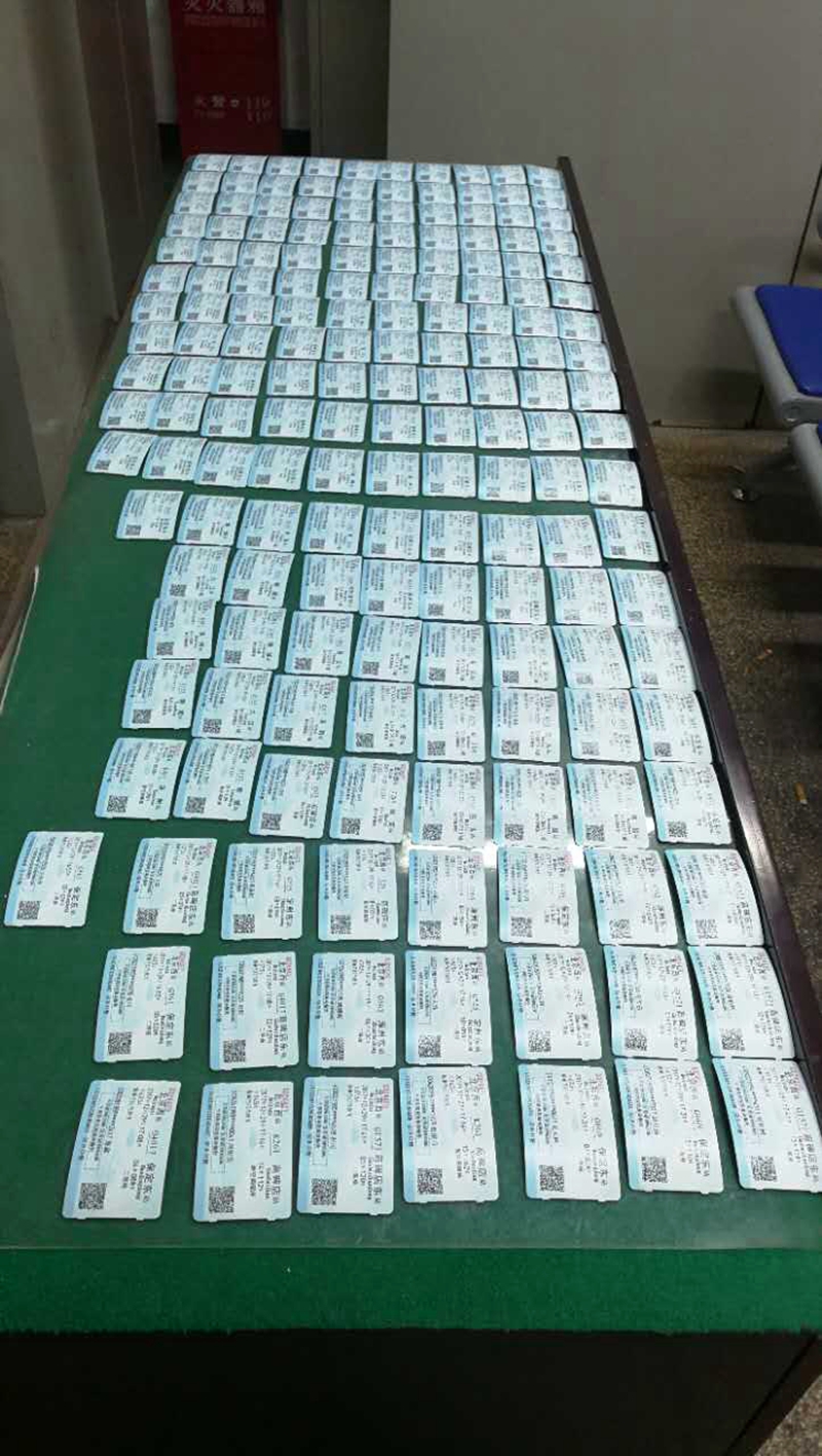 2017年12月29日11時(shí)許,北京公安處“獵鷹-2018”專項(xiàng)行動(dòng)小分隊(duì)便衣民警在北京西站北廣場(chǎng)附近抓獲一名涉嫌倒賣火車票的男子,民警當(dāng)場(chǎng)從其身上搜出火車票170余張,他人的二代身份證57張。