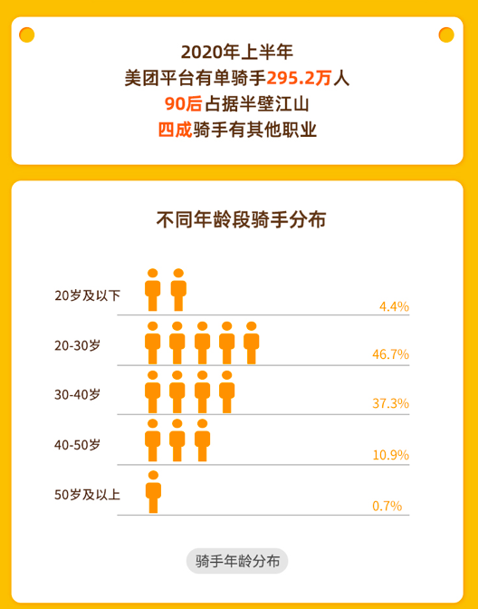 美團(tuán)16日發(fā)布的《2020上半年騎手就業(yè)報(bào)告》顯示,2020年上半年,通過美團(tuán)獲得收入的騎手總數(shù)達(dá)295.2萬人,同比增長16.4%。其中,來自國家建檔立卡貧困戶的新增騎手近8萬人。疫情影響下,“兼職做騎手”成為就業(yè)新趨勢,近四成騎手有其他職業(yè),其中不乏律師、舞蹈演員、導(dǎo)演、企業(yè)中層管理者、金融從業(yè)者、軟件工程師等群體。