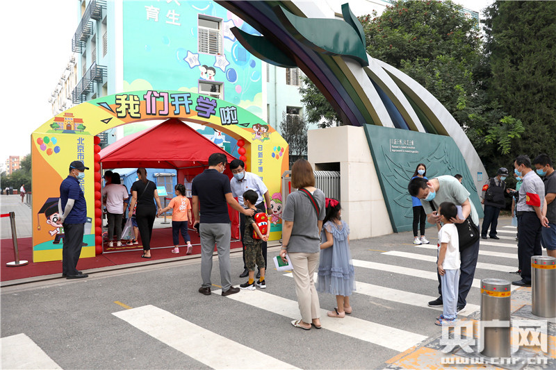 8月29日,北京市海淀外國語實(shí)驗(yàn)學(xué)校,一年級新生在家長陪同下入校(央廣網(wǎng)記者韓靖 攝)