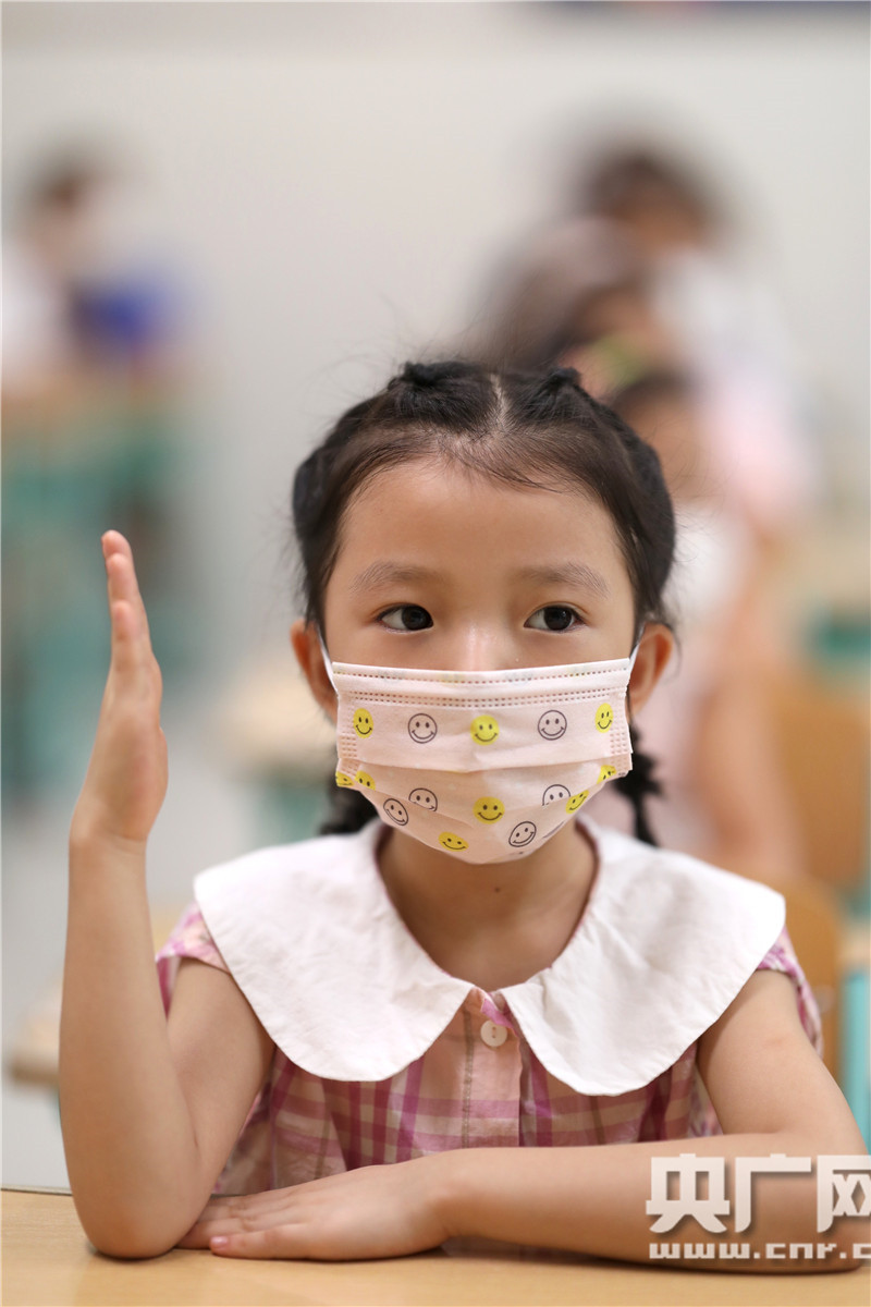 8月29日,北京市通州區(qū)玉橋小學(xué),一年級新生正在學(xué)習(xí)如何舉手回答問題(央廣網(wǎng)記者張佳琪 攝)