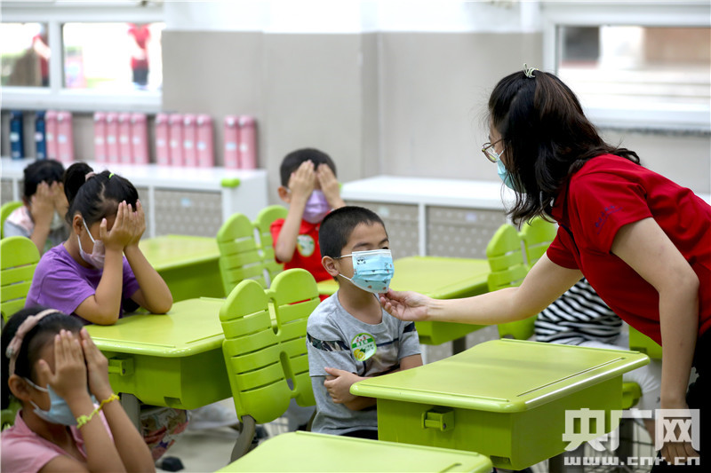 8月29日,北京市海淀外國語實(shí)驗(yàn)學(xué)校,老師為學(xué)生整理口罩(央廣網(wǎng)記者韓靖 攝)