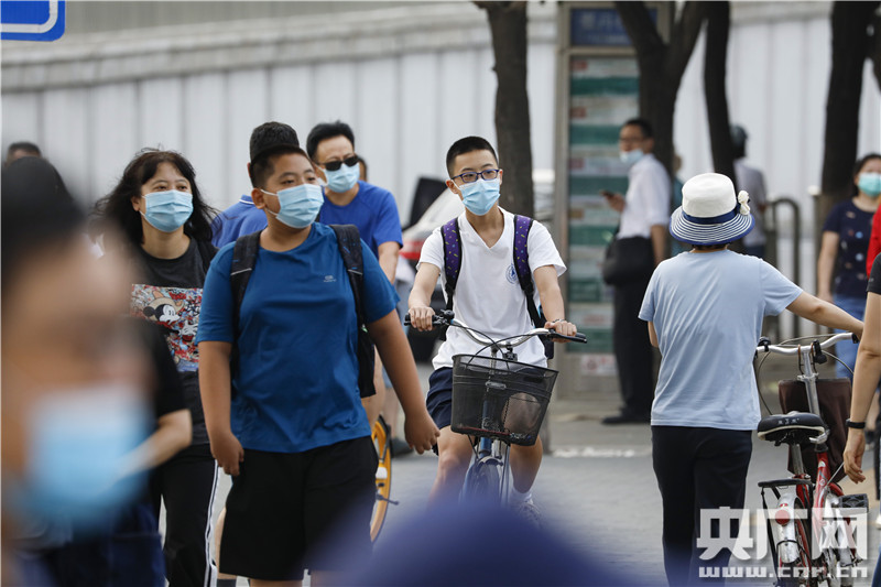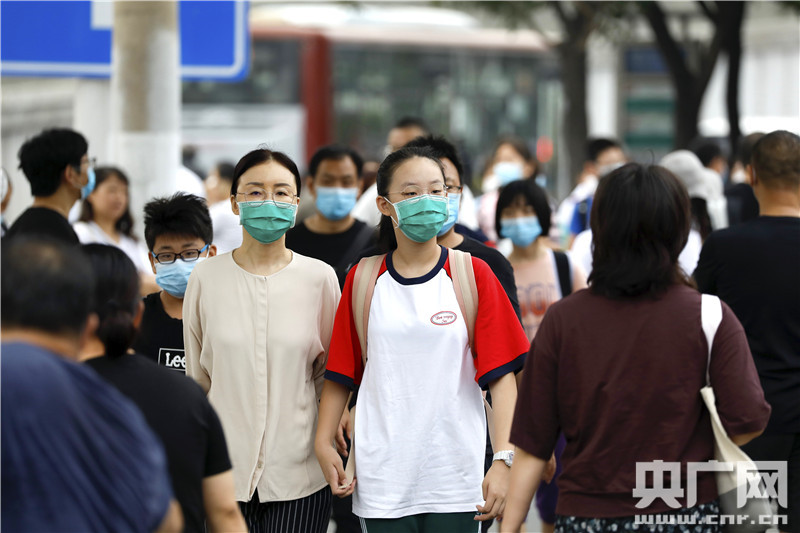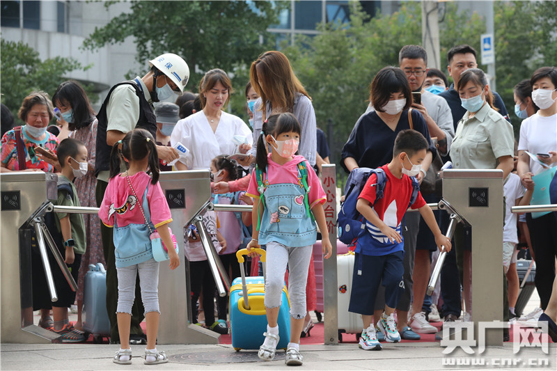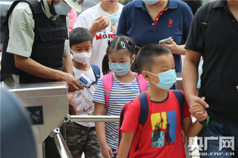 8月29日,北京市海淀外國語實(shí)驗(yàn)學(xué)校,學(xué)生和家長測量體溫后入校(央廣網(wǎng)記者韓靖 攝)