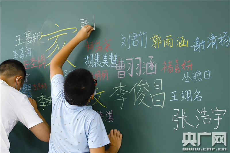 北京十二中科豐校區(qū),初一新生在黑板上寫下自己的名字(央廣網(wǎng)記者張凱航 攝)