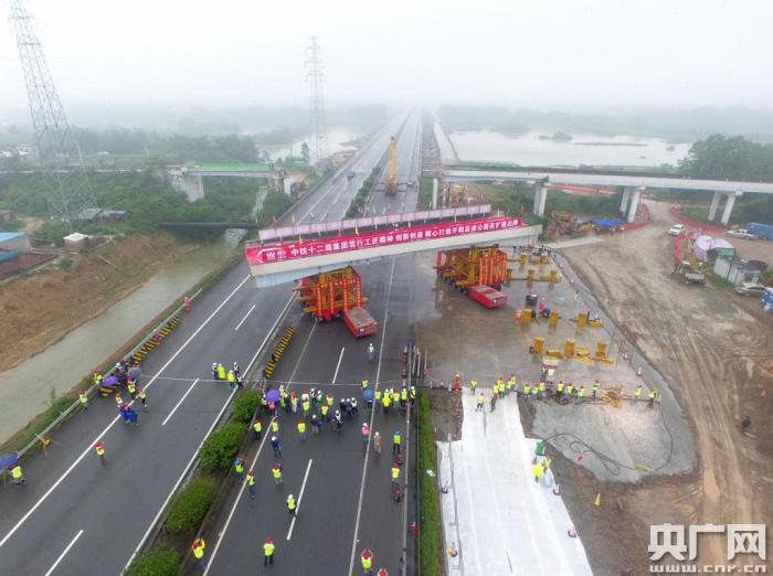 “在開(kāi)陽(yáng)高速公路正常通行的情況下,我們提前對(duì)天橋進(jìn)行全面測(cè)量、定位,并對(duì)天橋進(jìn)行預(yù)切割,將整座天橋分為3段,需要拆移的就是中間主跨段!睆V東省高速公路有限公司開(kāi)陽(yáng)擴(kuò)建管理處副主任黃正昌介紹,拆除之前,需要在存梁場(chǎng)先行組裝模塊車(chē),每個(gè)模塊之間的間距要控制在毫米級(jí),不能超過(guò)10毫米,否則運(yùn)載過(guò)程中可能出現(xiàn)無(wú)法變向、傾斜等問(wèn)題,也可能導(dǎo)致無(wú)法卸載。兩組模塊車(chē)在頂升梁體時(shí),要保持同步,誤差不能超過(guò)3兆帕。運(yùn)載梁體過(guò)程中,要精確控制模塊車(chē)行駛速度,車(chē)速保持500米/小時(shí),1分鐘行駛8.3米,相當(dāng)于一個(gè)人正常步行速度的1/8。